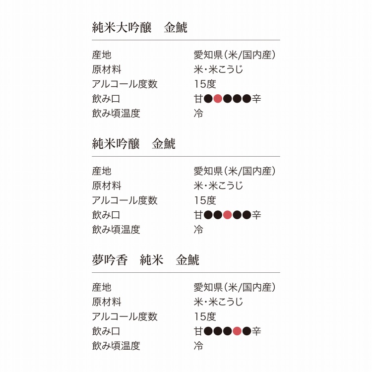 商品内容●純米大吟醸 金鯱720ml×2、純米吟醸 金鯱720ml×2、夢吟香 純米 金鯱720ml×2、コースター付