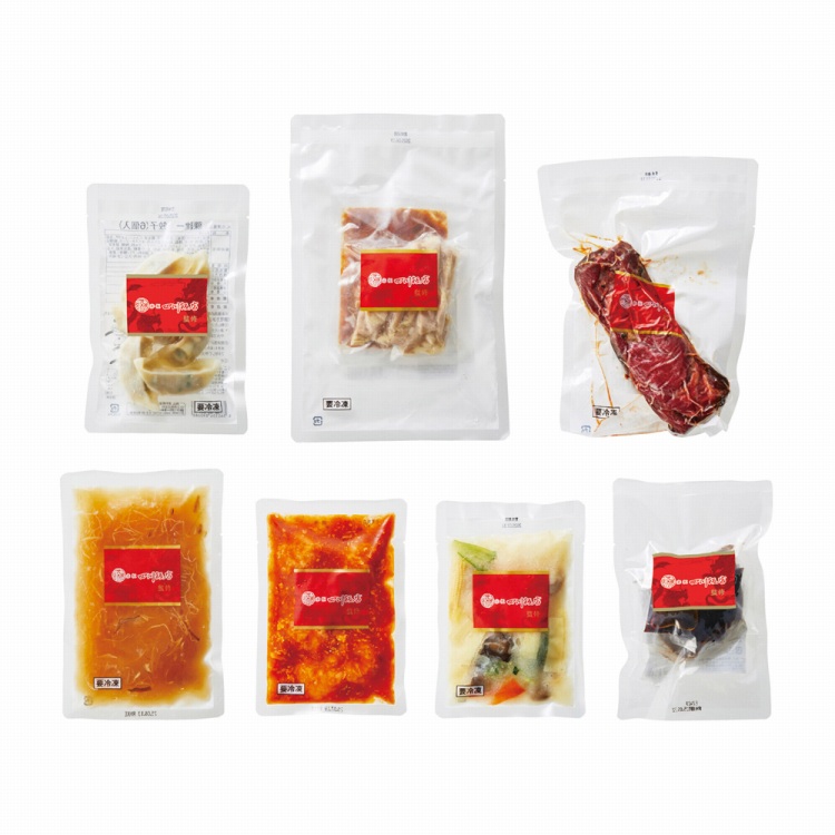 商品内容●セット内容:国産牛ローストビーフ(モモ/国内産)190g(ローストビーフ150g、特製ピリ辛ソース40g)・つるし焼豚430g・大海老チリソース180g・魚翅湯(フカヒレ入りスープ)250g・本格海鮮八宝菜200g・棒々鶏セット150g(蒸し鶏110g、ソース40g)各1、餃子×6