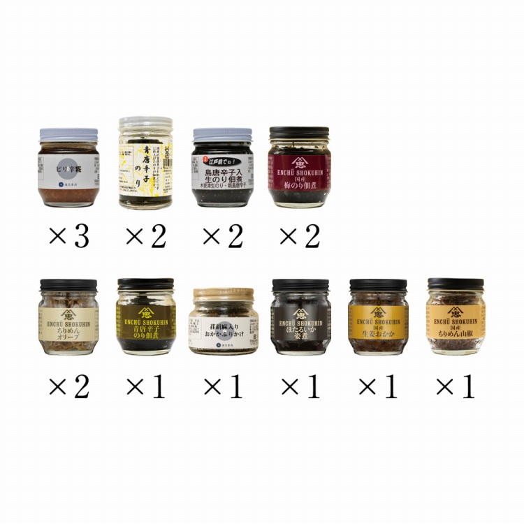 商品内容●セット内容:ピリ辛糀85g×3、青唐辛子のり佃煮140g・江戸前でぃ!島唐辛子入生のり佃煮85g・国産梅のり佃煮80g・ちりめんオリーブ35g各2、青唐辛子のり佃煮80g・荏胡麻入りおかかふりかけ60g・ほたるいかの姿煮60g・国産生姜おかか60g・国産ちりめん山椒40g各1