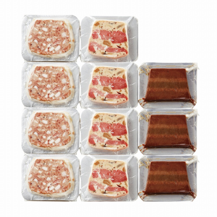 商品内容●セット内容:パテドカンパーニュ50g・ポークとナッツのテリーヌ50g各4、レバーパテのオペラ風50g×3