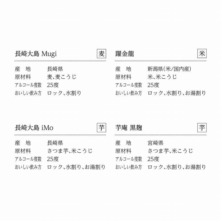 商品内容●長崎大島 Mugi720ml、 長崎大島 iMo720ml、躍金龍720ml、芋庵 黒麹720ml、コースター付