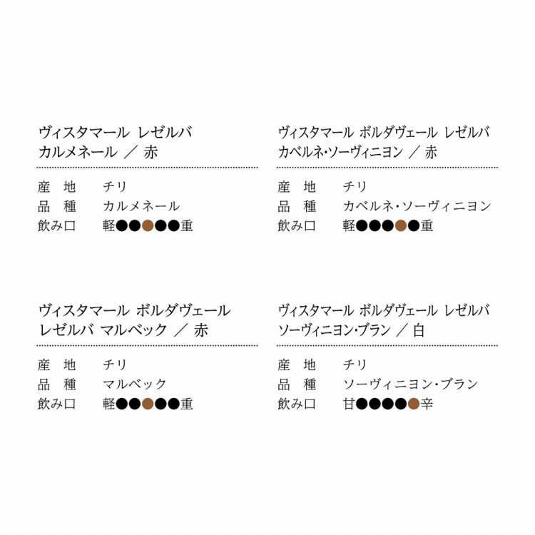 商品内容●ヴィスタマール レゼルバ カルメネール750ml×1、ヴィスタマール ボルダヴェール レゼルバ マルベック750ml×1、ヴィスタマール ボルダヴェール レゼルバ カベルネ・ソーヴィニヨン750ml×2、ヴィスタマール ボルダヴェール レゼルバ ソーヴィニヨン・ブラン750ml×2