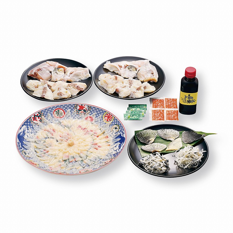 商品内容●セット内容:刺身(天然)160g・ふぐヒレ5枚(養殖)各1、皮(養殖)60g・ふぐちり(養殖)300g各2、ふくポン酢・もみじおろし・かぼす果汁・陶器絵皿(約径33cm)付
