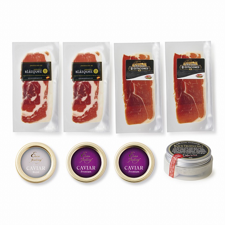 商品内容●セット内容:ハモンイベリコ30g・ハモンテルエル30g・オセトラプレミアムキャビア50g各2、黒トリュフソルト50g・オセトラロイヤルキャビア50g各1