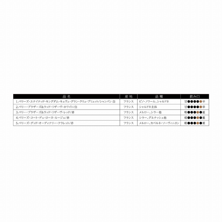 商品内容●ベリーズ・ユナイテッド・キングダム・キュヴェ・グラン・クリュ・ブリュット750ml、ベリー・ブラザーズ&ラッド・リザーヴ・ホワイト750ml、ベリー・ブラザーズ&ラッド・リザーヴ・レッド750ml、ベリーズ・コート・デュ・ローヌ・ルージュ750ml、ベリーズ・グッド・オーディナリー・クラレット750ml