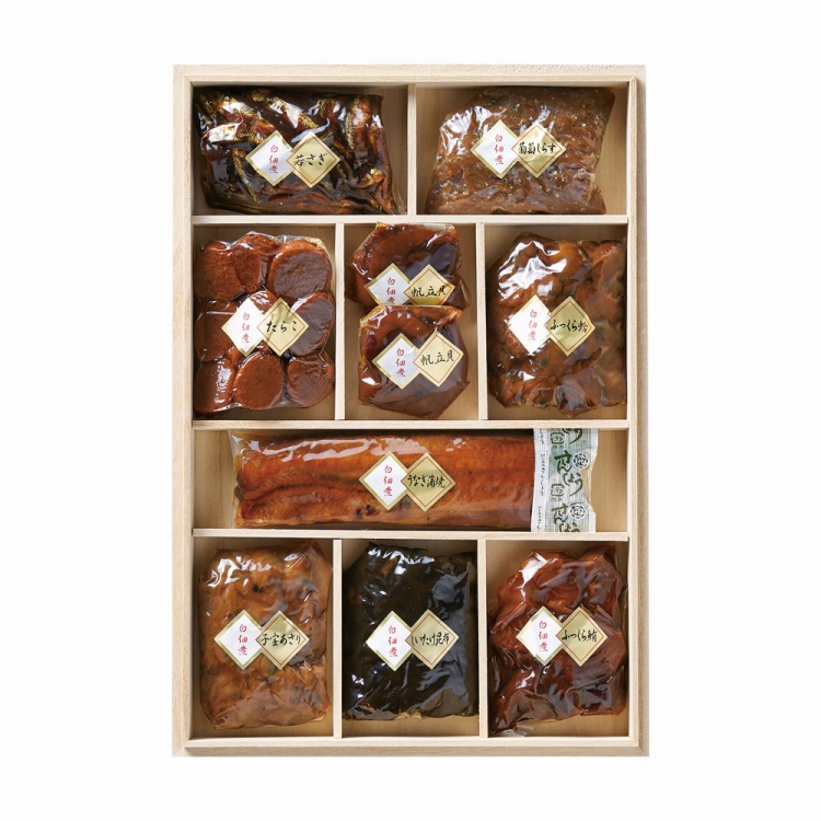 商品内容●セット内容:若さぎ飴煮70g・葡萄しらす70g・たらこ70g・大粒帆立50g(2粒)・ふっくら蛤70g・鰻蒲焼95g、山椒付・子宝あさり70g・しいたけ昆布70g・ふっくら鮪70g各1