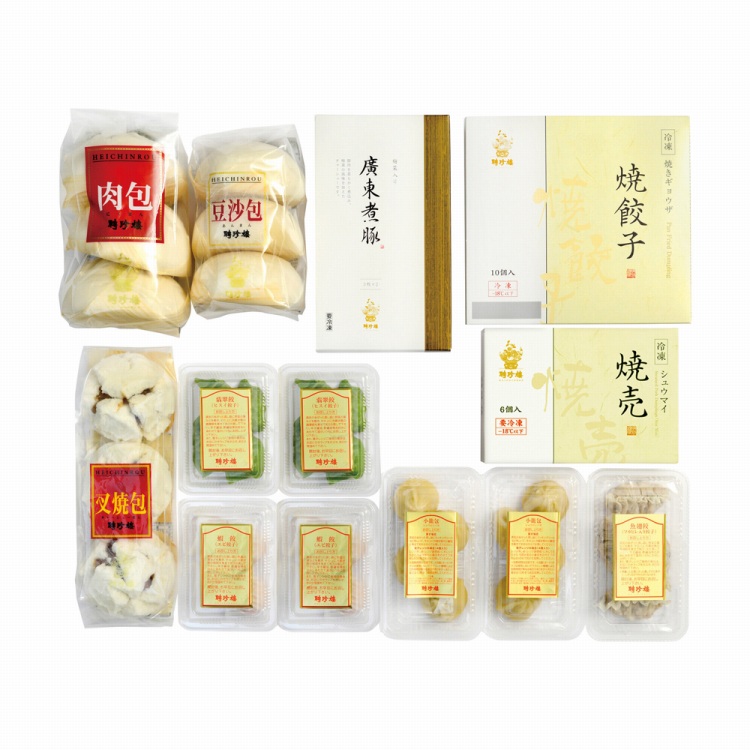 商品内容●セット内容:肉まん200g・あんまん135g・叉焼まん90g各3、焼売30g×6、えび蒸し餃子20g・ひすい餃子20g・小籠包30g各8、ふかひれ入り餃子28g×4、焼餃子22g×10、廣東煮豚360g(3枚入×2)