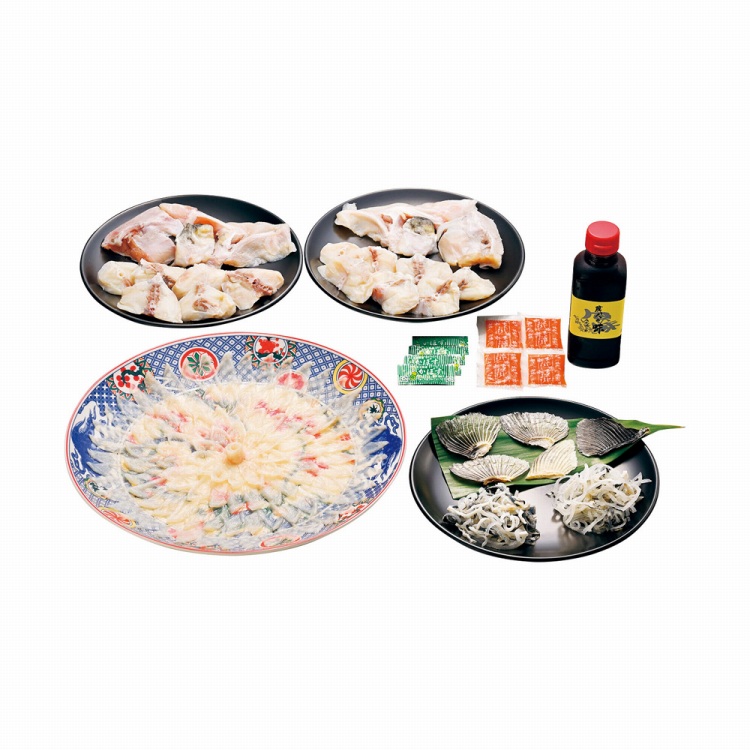 商品内容●セット内容:刺身(天然)160g・ふぐヒレ5枚入(養殖)各1、皮(養殖)60g・ふぐちり(養殖)300g各2、ふくポン酢・もみじおろし・かぼす果汁・陶器絵皿(約径33cm)付