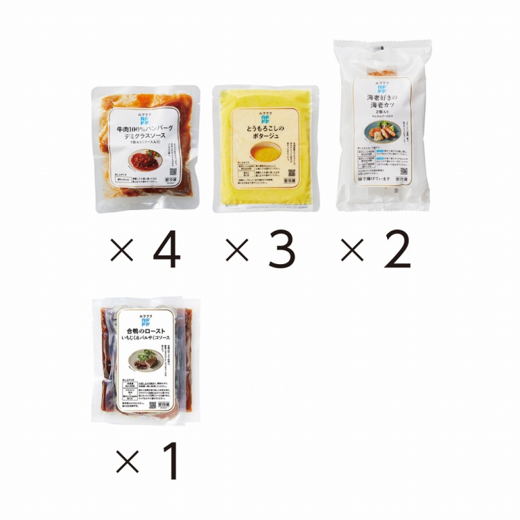 商品内容●セット内容:牛肉100%ハンバーグデミグラスソース180g(固形量100g)×4、とうもろこしのポタージュ180g×3、海老好きの海老カツ2個入り180g(海老カツ140g・タルタルソース40g)×2、合鴨のローストいちじく&バルサミコソース220g(合鴨150g・いちじく&バルサミコソース70g)×1