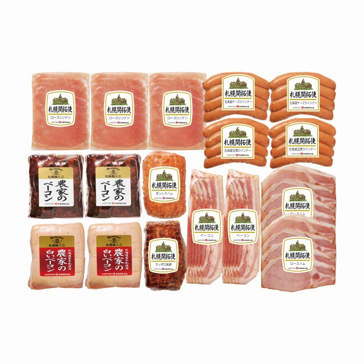 商品内容●セット内容:ロースシンケン(生ハム)40g×3、北海道チーズウインナー100g・北海道玉葱ウインナー100g・北海道産ベーコン80g・北海道産ロースハム65g・農家のベーコン400g・農家の白いベーコン400g各2、ボンレスハム300g・サッポロ焼豚300g各1