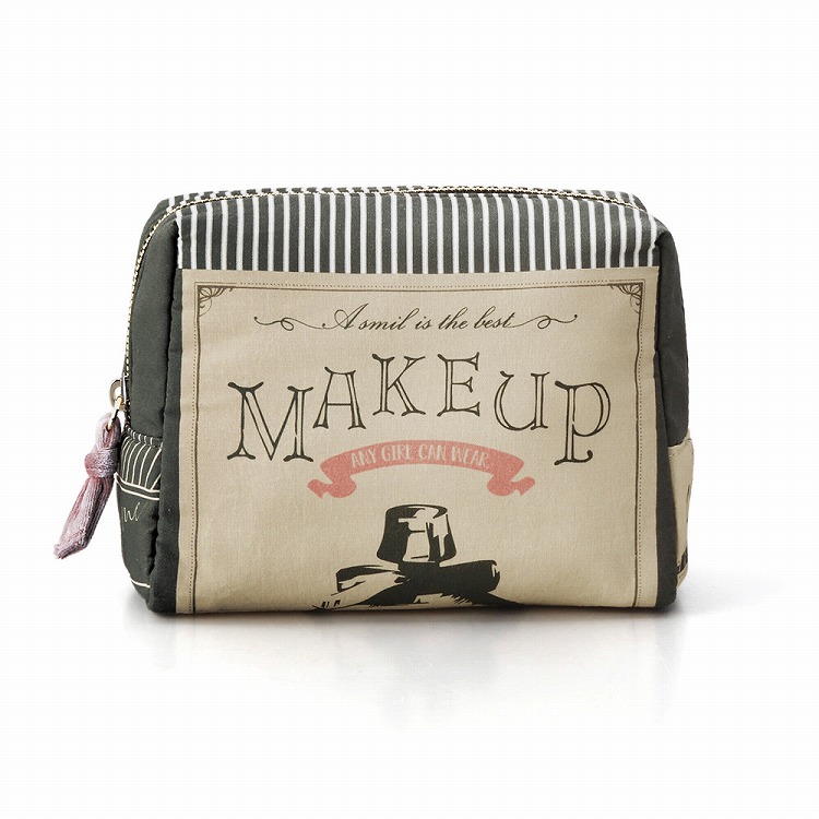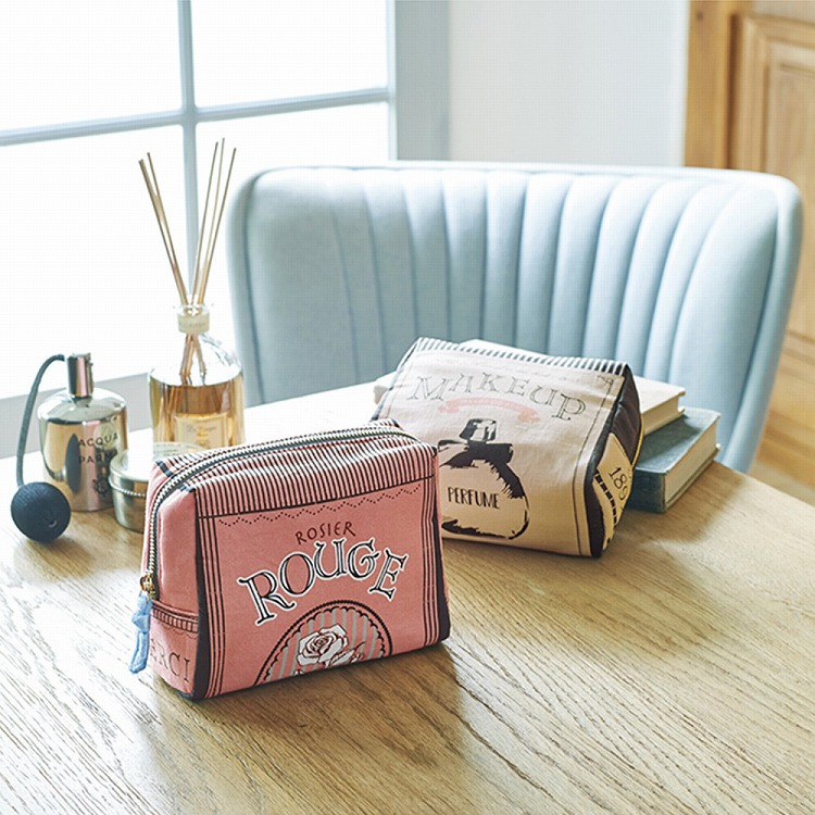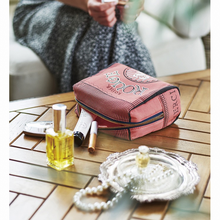 女の子が好きなモチーフを盛り込んだアンティークのポスターのような雰囲気のデザインがかわいいポーチ。