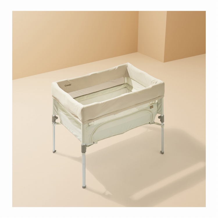 コンパクトな設計のベビーベッドは使用シーンに合わせて2段階の高さ調節が可能。