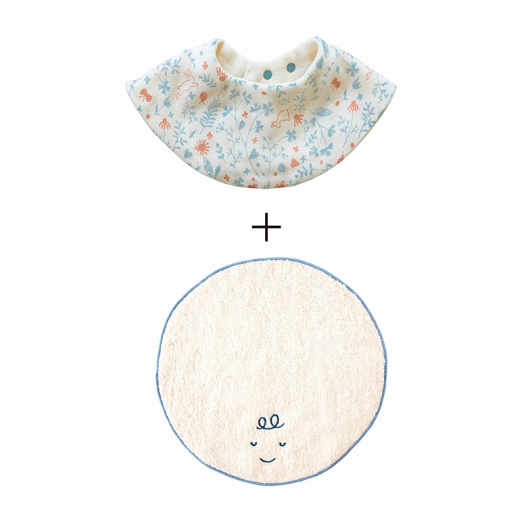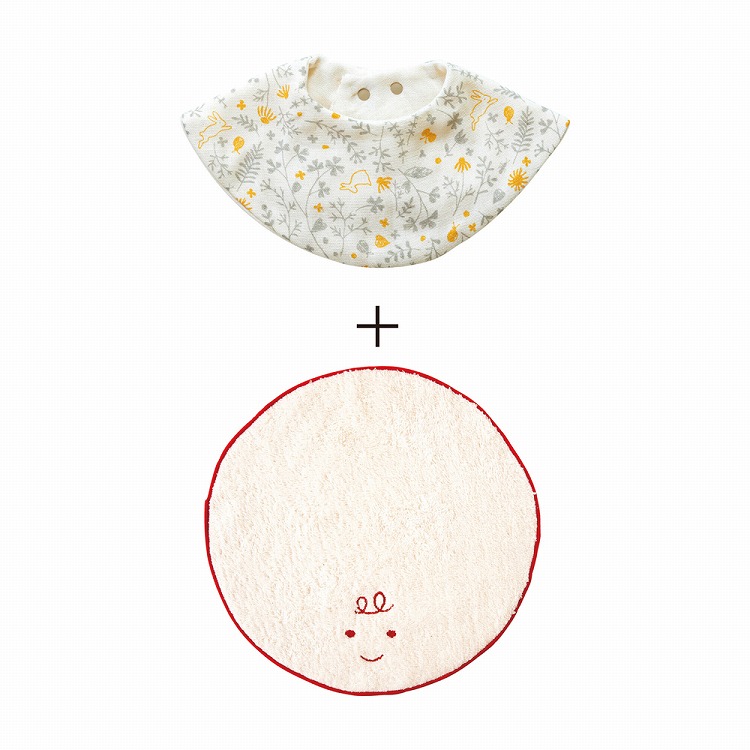 オーガニックコットンのガーゼ生地を6重にして織り上げた柔らかい肌触りのサークルスタイと、かわいいお顔の刺?が入ったオーガニックコットンハンカチのセットです。
