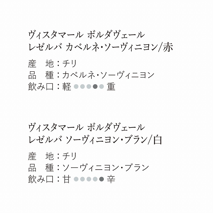 果実味が感じられるカベルネ・ソーヴィニヨン、ライムなどの柑橘類と青りんごの華やかなアロマが感じられるソーヴィニヨン・ブランのセットです。