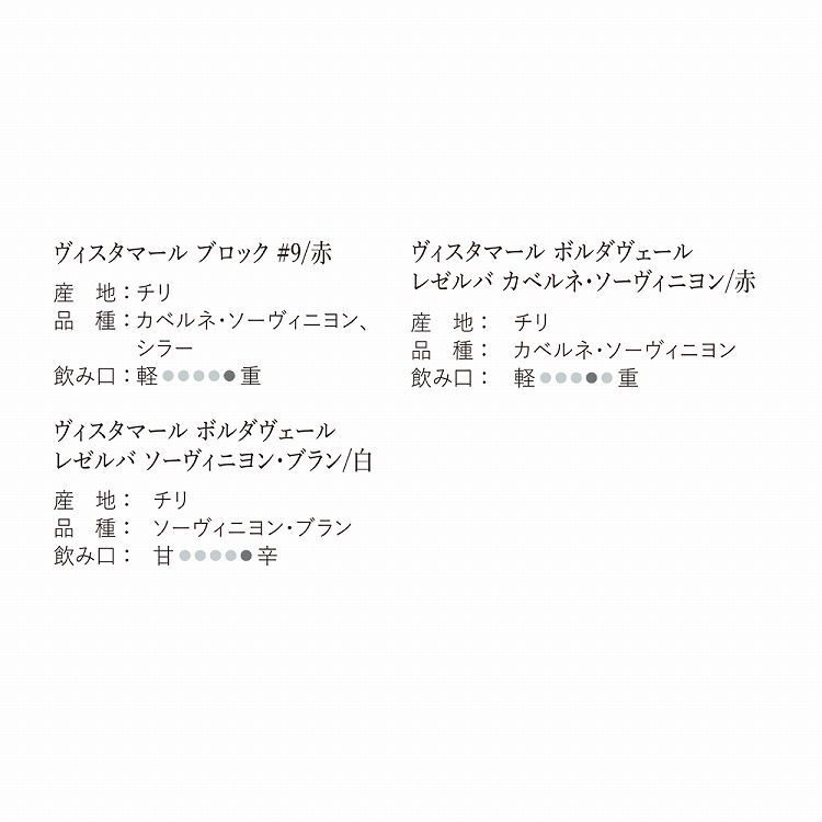 商品内容●ヴィスタマール ブロック #9 750ml・ヴィスタマール ボルダヴェール レゼルバ カベルネ・ソーヴィニヨン750ml・ヴィスタマール ボルダヴェール レゼルバ ソーヴィニヨン・ブラン750ml各2、ソムリエナイフ(中国製)付