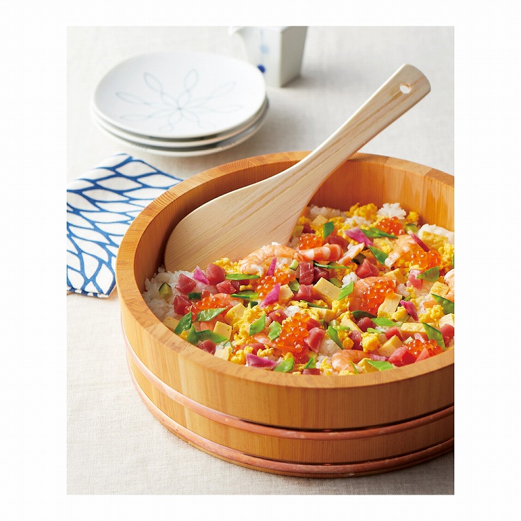 木曽さわらはご飯への匂い移りが少ない素材で、すし飯やお料理の盛り込みの器としてお使いいただけます。
