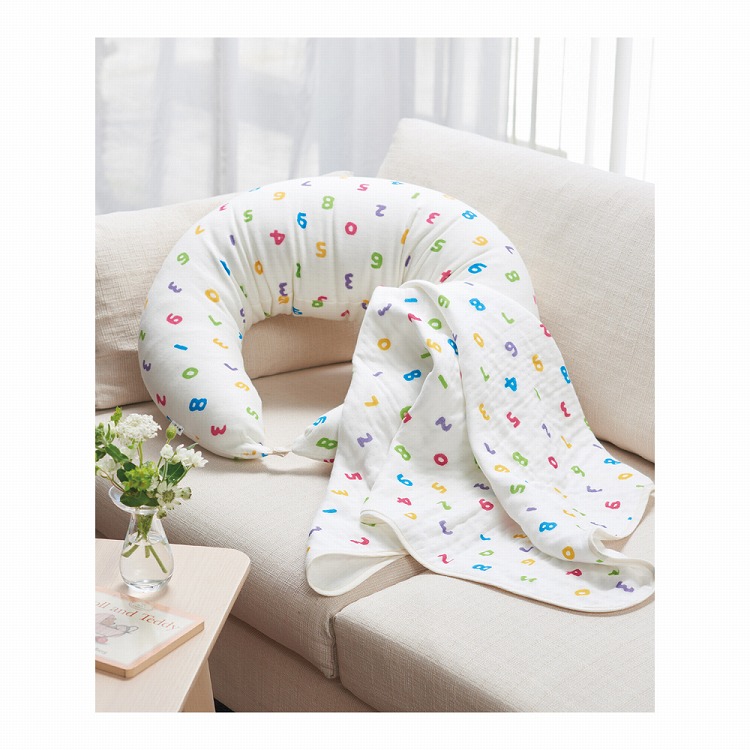 カラフルな数字が散りばめられたデザインの授乳クッションとベビーケットのセットです。