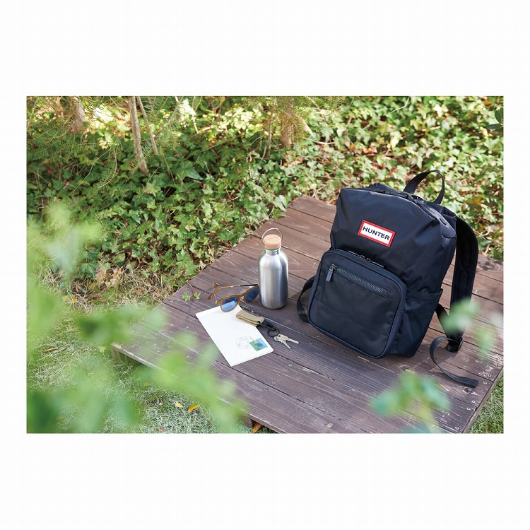 老舗ブランドが貫く豊かな自然との共存の姿勢。 「HUNTER(ハンター)」は、ベーシックなデザインと高い機能性を兼ね備えた靴やアウターウエアなどの分野で数々の名作を生み出してきたイギリスの老舗ブランド。 シンボルであるブーツは特に有名で、世界中の著名人からも愛されてきました。製品やパッケージには、リサイクルできる素材を採用しています。森林を守る運動に力を入れるほか、店舗やオフィスから出る二酸化炭素を削減するなど、環境を守る企業の先駆けとなるのも自分たちの使命と考えています。 耐水性と機能性を兼ね備えたナイロン性のバックパックは、耐水性のある100%リサイクルナイロンの表地と、リサイクルジャカードの裏地を使用。バッグ前面にはカードやペンを仕分けて収納できるジップ式の多機能ポケットが配置されています。背面にはメッシュ生地を採用し、快適さと通気性をアップ。側面には、調節可能なサイドポケットが付いています。