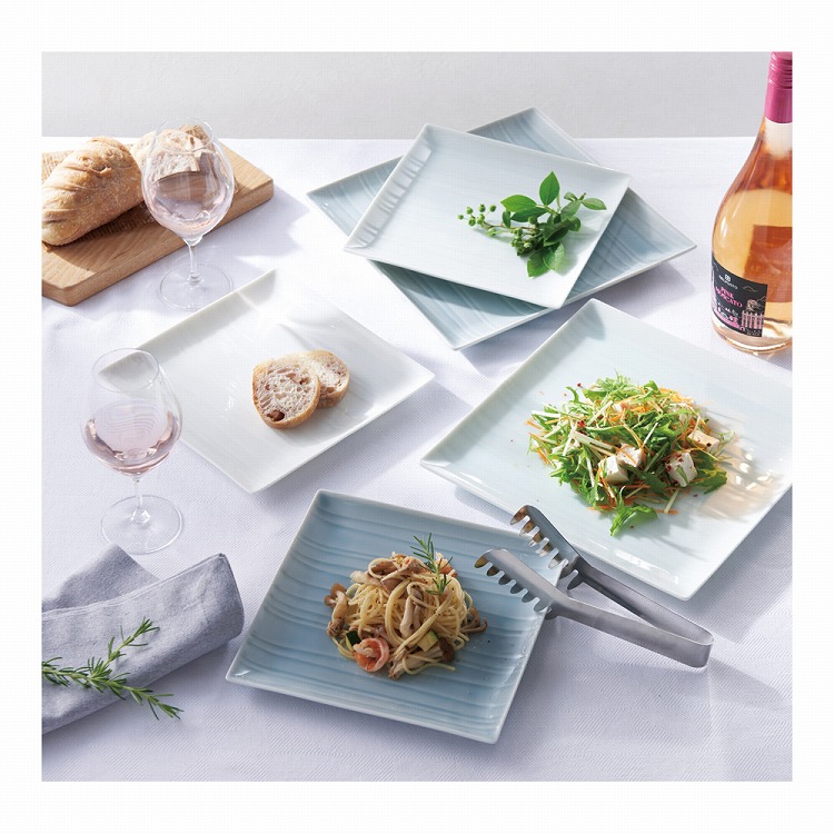 商品内容●商品:正角皿大(約26.5×26.5×高さ1.7cm)・中(約21×21×高さ1.7cm)各3・トング×1