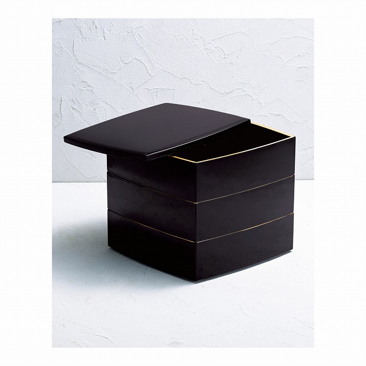 側面の金線と丸みを帯びたフォルムがおしゃれな山中塗の三段重です。