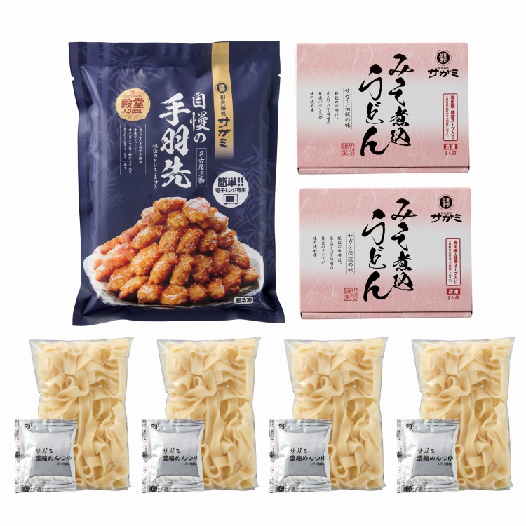 商品内容●セット内容:みそ煮込うどん(麺142g、濃縮みそスープ付)×2、きしめん(麺220g、濃縮めんつゆ)×4、手羽先(10本入、たれ・ごま付)×1