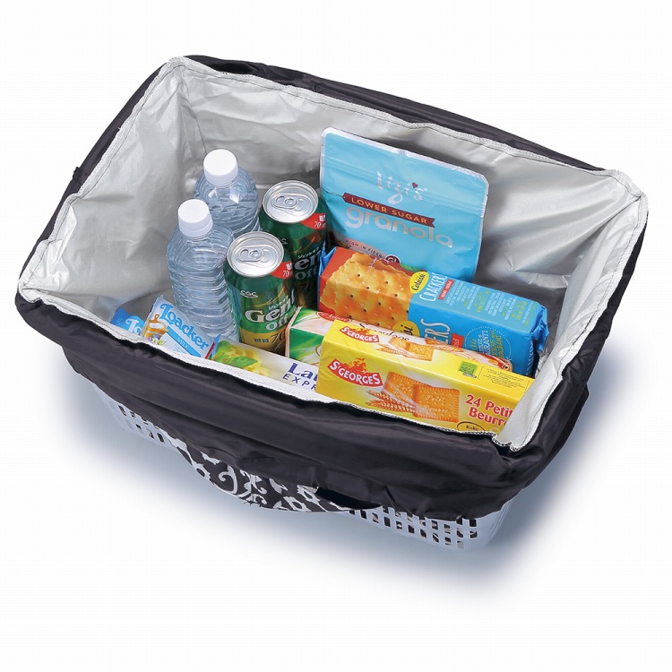 スーパーのレジカゴと同じ容量が入り、保冷保温機能を備えたこのバッグは、大容量ながらコンパクトに折りたためるので持ち運びに便利です。