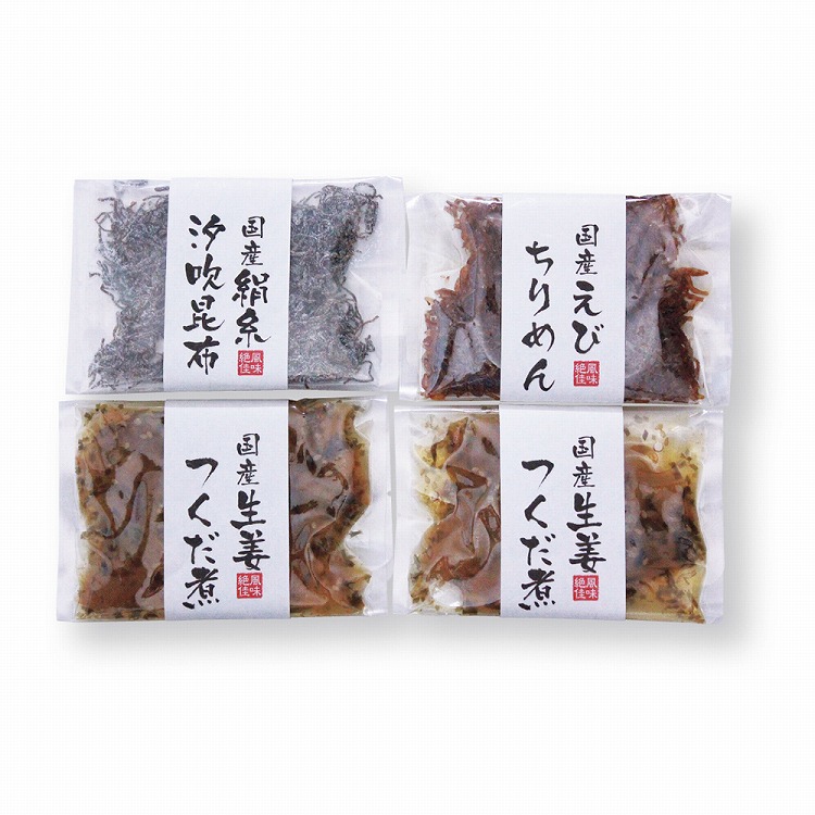 商品内容●セット内容:生姜つくだ煮50g×2、えびちりめん30g・絹糸汐吹昆布20g各1