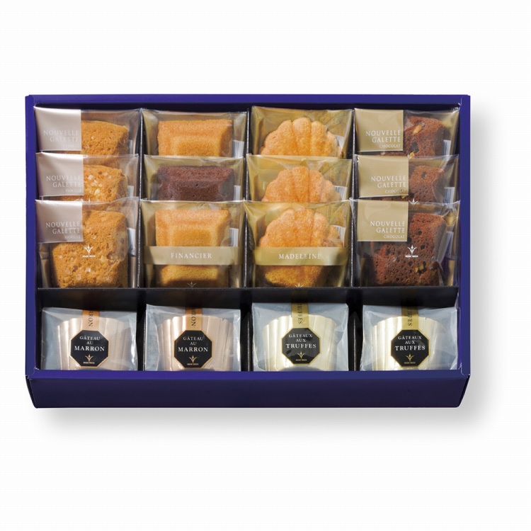 商品内容●セット内容:マドレーヌ・ヌーヴェルガレット(バニラ)・ヌーヴェルガレット(チョコ)各3、トリュフケーキ・ガトー オ マロン・フィナンシェ各2、フィナンシェショコラ×1