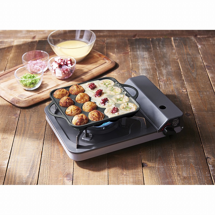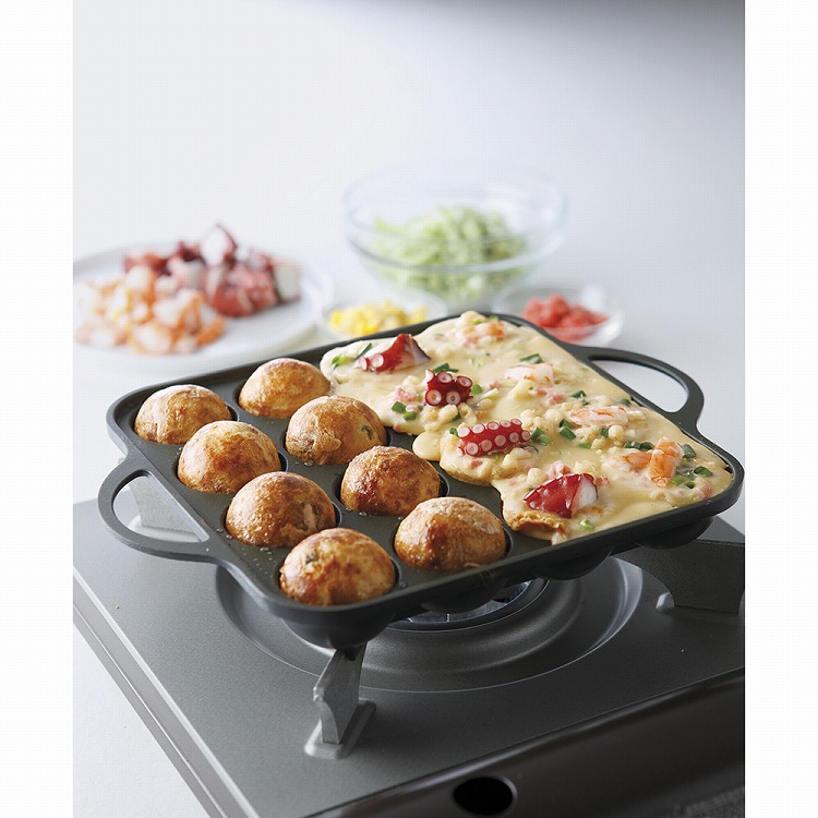 たこ焼きが返しやすく焦げ付きにくいフッ素樹脂加工が施されたガス火専用のたこ焼き器。