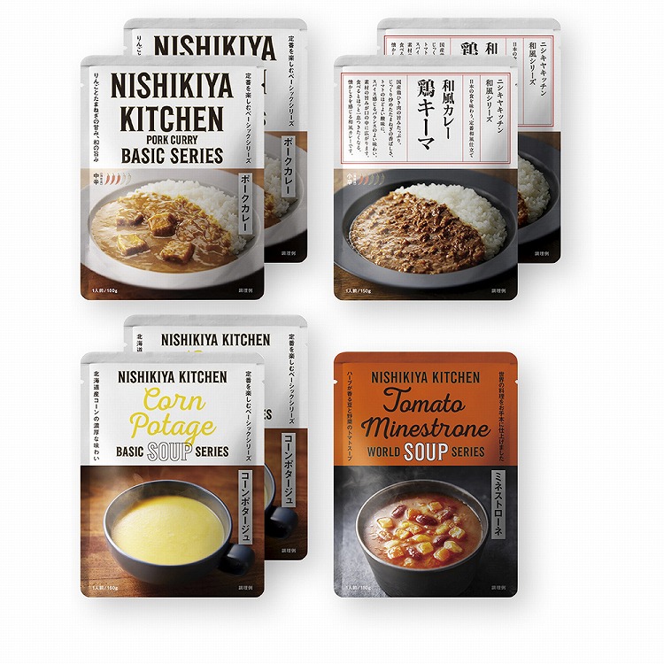 商品内容●セット内容:ポークカレー(中辛)180g・鶏キーマカレー(小辛)150g・コーンポタージュ160g各2・ミネストローネ180g×1