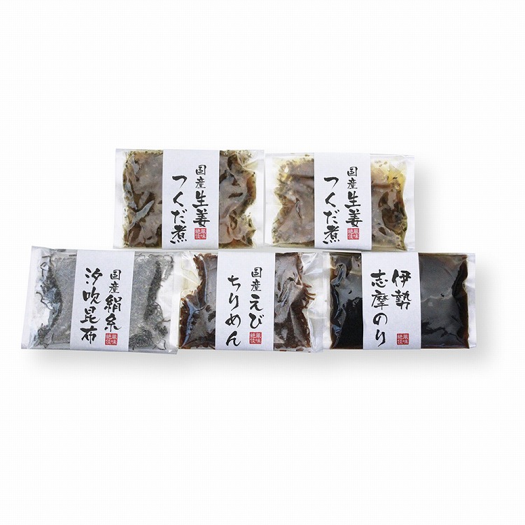 商品内容●セット内容:生姜つくだ煮50g×2、伊勢志摩のり100g・えびちりめん30g・絹糸汐吹昆布20g各1