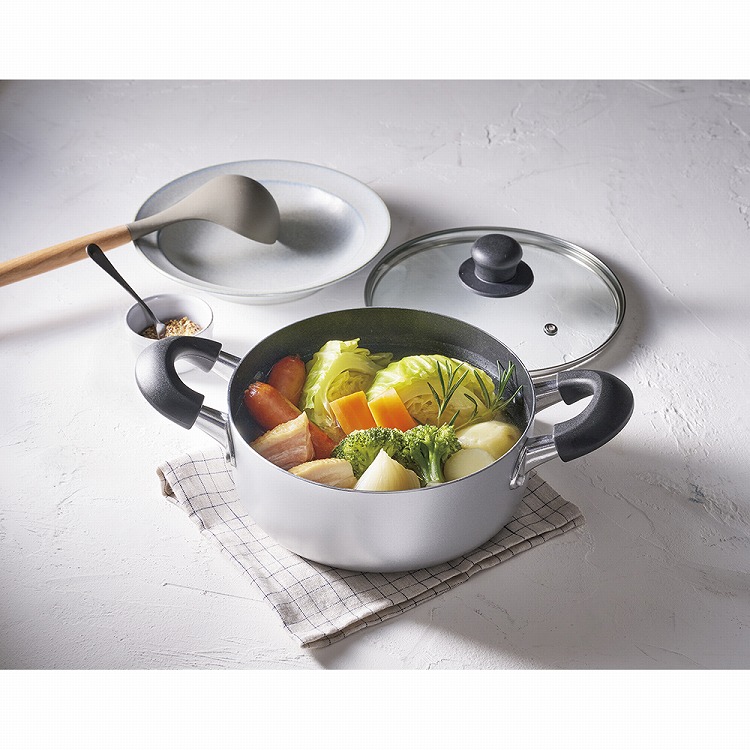 ●材質:本体/アルミニウム合金(外面焼付塗装)、貼り底/ステンレス鋼(底厚2.3mm)、蓋/ガラス
