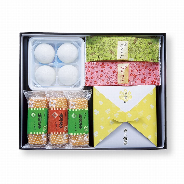 商品内容●セット内容:蒸し饅頭(4個入)・袖ヶ浦最中こし餡各2、栗ひとつぶ・杏ひとつぶ・袖ヶ浦最中つぶ餡各1