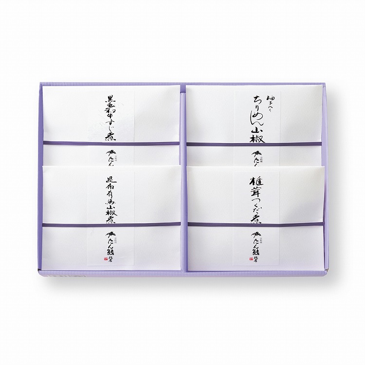 商品内容●セット内容:黒毛和牛すじ煮70g・柚子入ちりめん山椒50g・昆布有馬山椒煮70g・椎茸つくだ煮80g各1