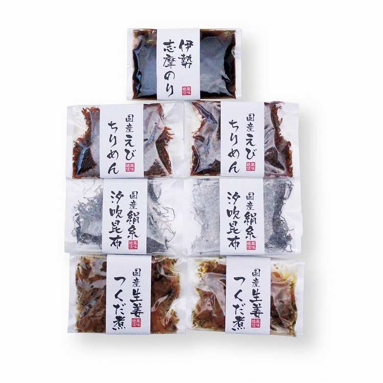 商品内容●セット内容:生姜つくだ煮50g・えびちりめん30g・絹糸汐吹昆布20g各2、伊勢志摩のり100g×1