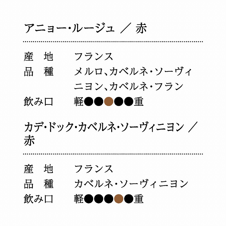 商品内容●アニョー・ルージュ750ml、カデ・ドック・カベルネ・ソーヴィニヨン750ml、ソムリエナイフ付