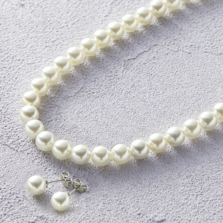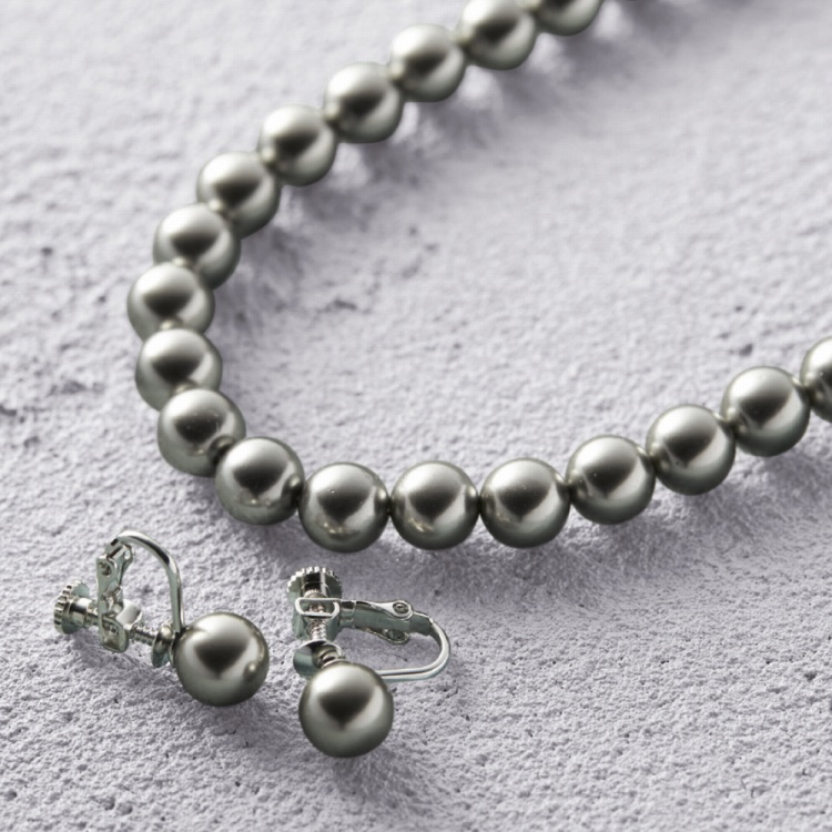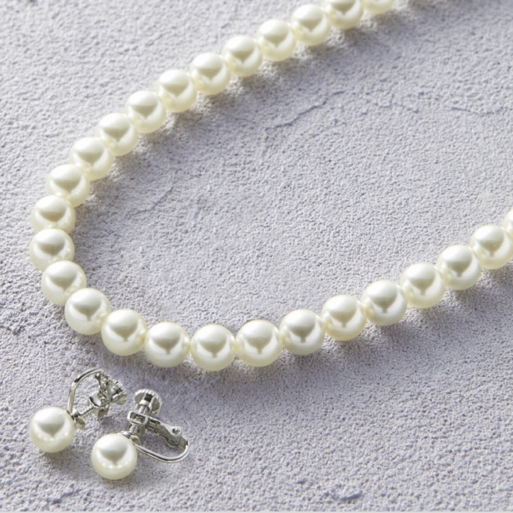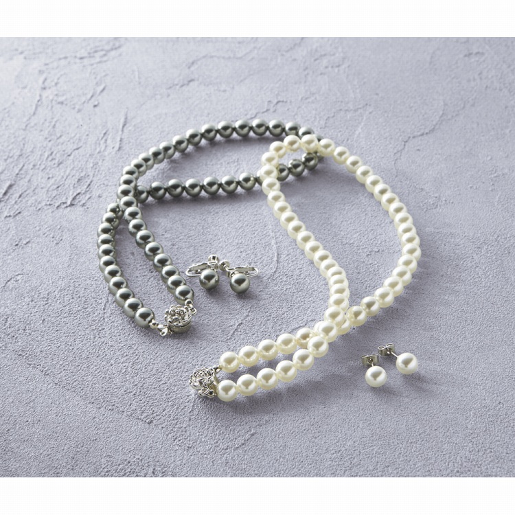 ●材質:ネックレス・イヤリング/人工貝パール(約径8mm)・真鍮(ロジウムメッキ)、ピアス/(本体)人工貝パール(約径8mm)・(ポスト)サージカルステンレス・(キャッチ)真鍮(ロジウムメッキ)