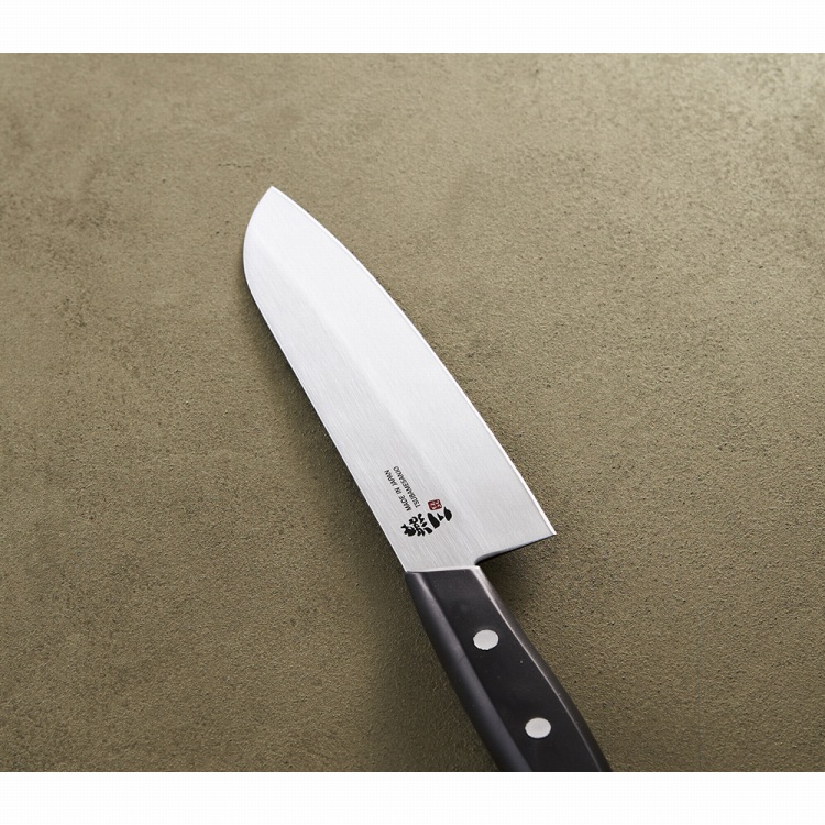 刃は錆びに強く、切れ味の良いステンレス刃物鋼を使用し、肉や魚・野菜など万能に使える三徳包丁です。