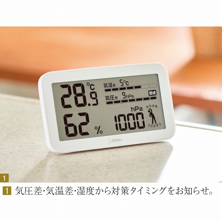 見やすい大画面と注意喚起を促すアイコンで、気象病対策をサポートします。