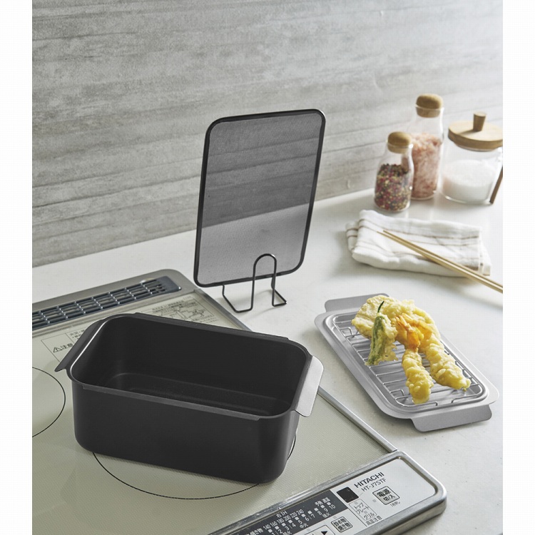 長い食材も揚げやすい角型の天ぷら鍋に、油ハネをガードするオイルスクリーンをセット。