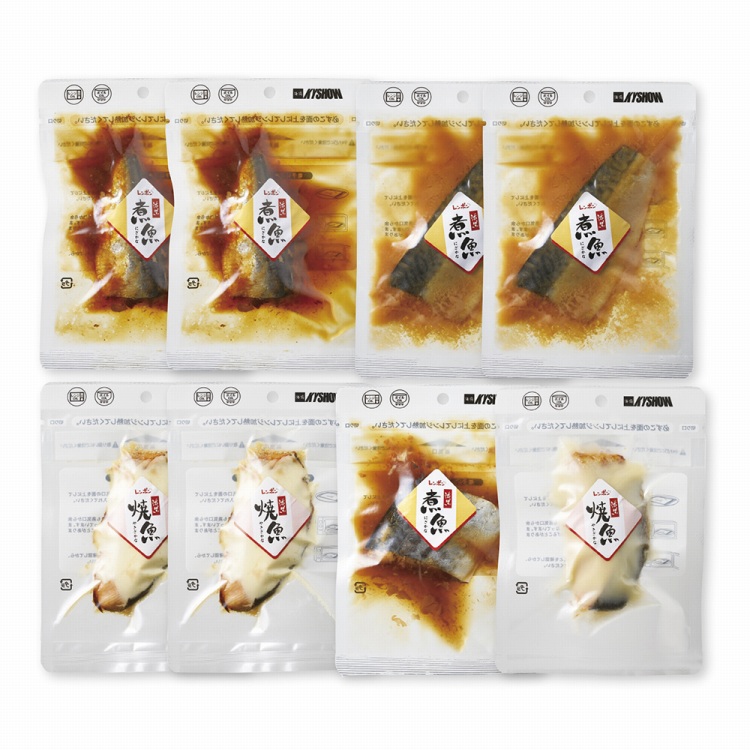 商品内容●セット内容:さば味噌煮70g・いわし煮付け50g・鮭マヨネーズ焼50g各2、さわら煮付け70g・鮭チーズ焼50g各1