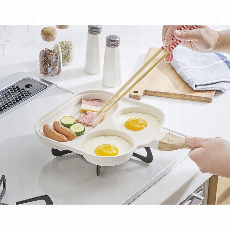 仕切り付きで別々の調理が同時にできるので忙しい朝にも便利なフライパンです。