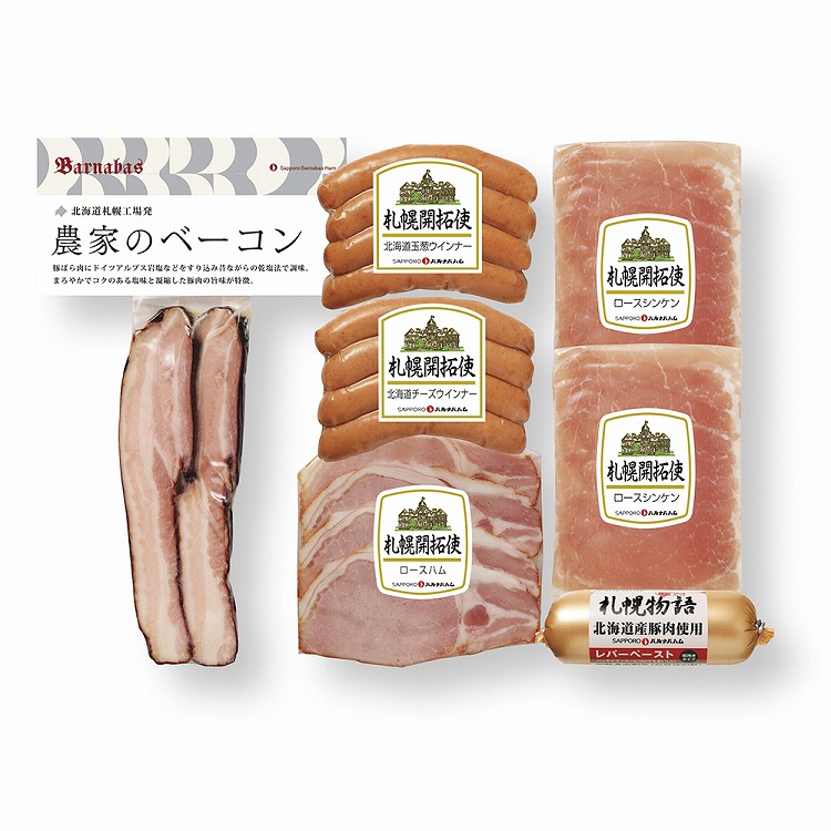 商品内容●セット内容:ロースシンケン(生ハム)40g×2、農家のベーコンステーキカット126g・北海道チーズウインナー100g・北海道玉葱ウインナー100g・レバーペースト100g・ロースハム65g各1
