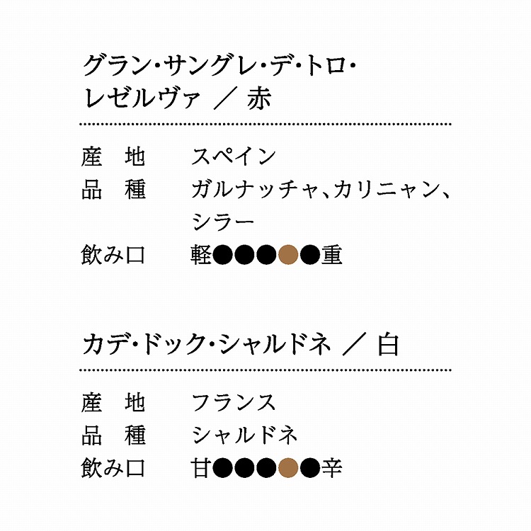 商品内容●グラン・サングレ・デ・トロ・レゼルヴァ750ml、カデ・ドック・シャルドネ750ml、ソムリエナイフ付
