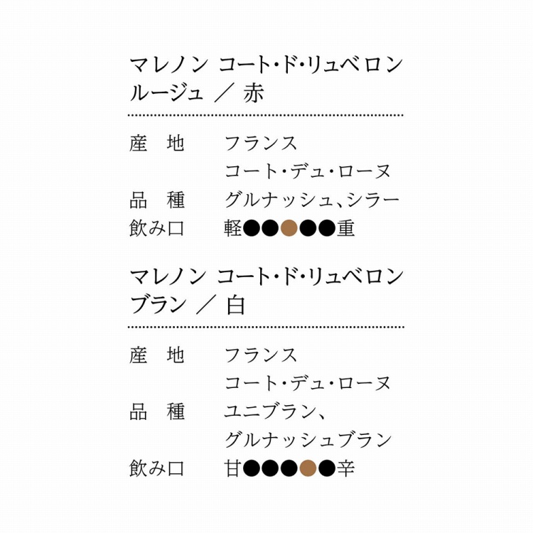 商品内容●マレノン コート・ド・リュベロン ルージュ750ml、マレノン コート・ド・リュベロン ブラン750ml、ソムリエナイフ付