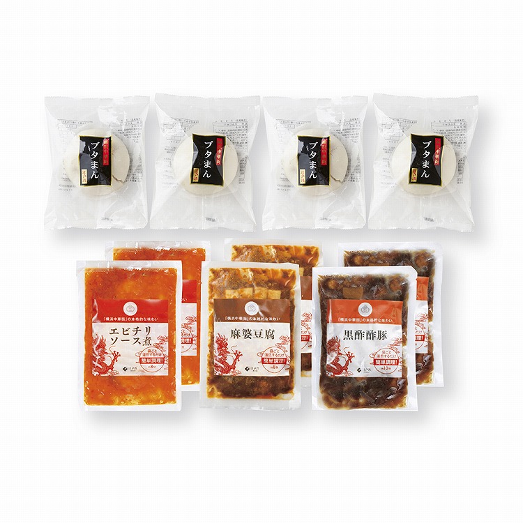 商品内容●セット内容:ブタまん120g×4、黒酢酢豚170g・麻婆豆腐170g・エビチリソース煮170g各2