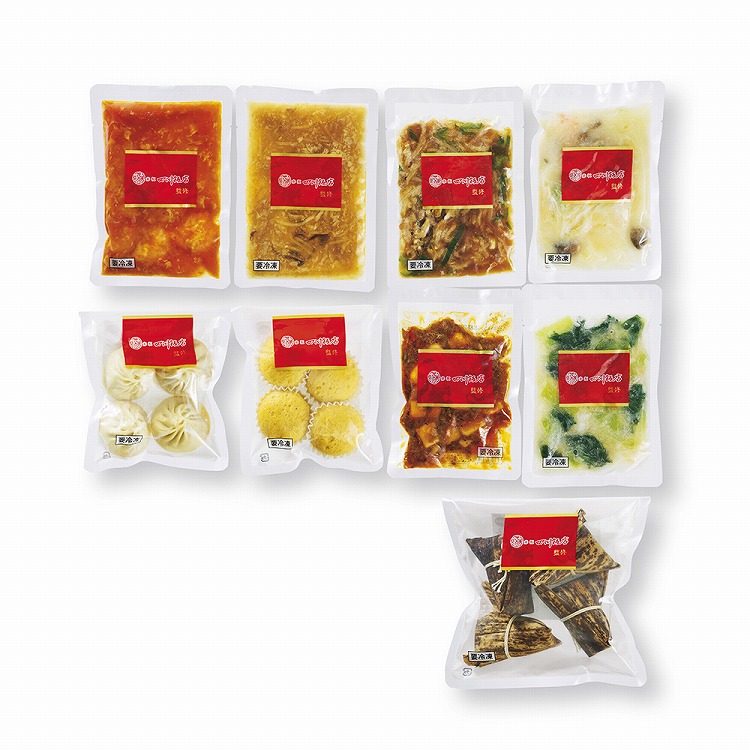 商品内容●セット内容:本格四川麻婆豆腐150g・大海老チリソース180g・干し貝柱とチンゲン菜のうま煮150g・酸辣湯150g・青椒肉絲150g・本格海鮮八宝菜200g・角煮入りちまき240g(4個入)・小籠包140g(4個入)・マーラーガオ100g(4個入)各1