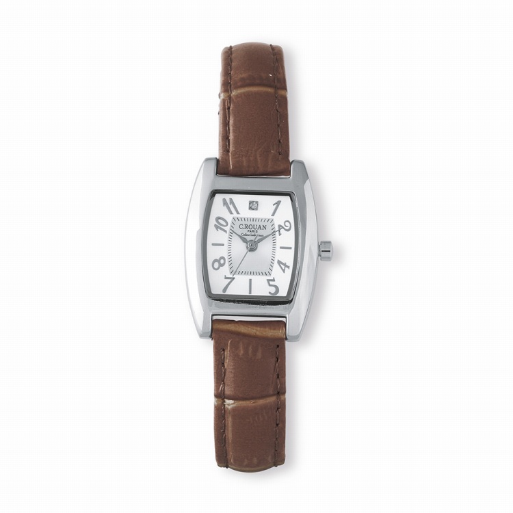 ●材質:本体/亜鉛合金(パラジウムメッキ)、ベルト/(表)牛革(ワニ型押し)・(裏)合成皮革、文字盤/ダイヤモンド1石(0.01ct)・白蝶貝