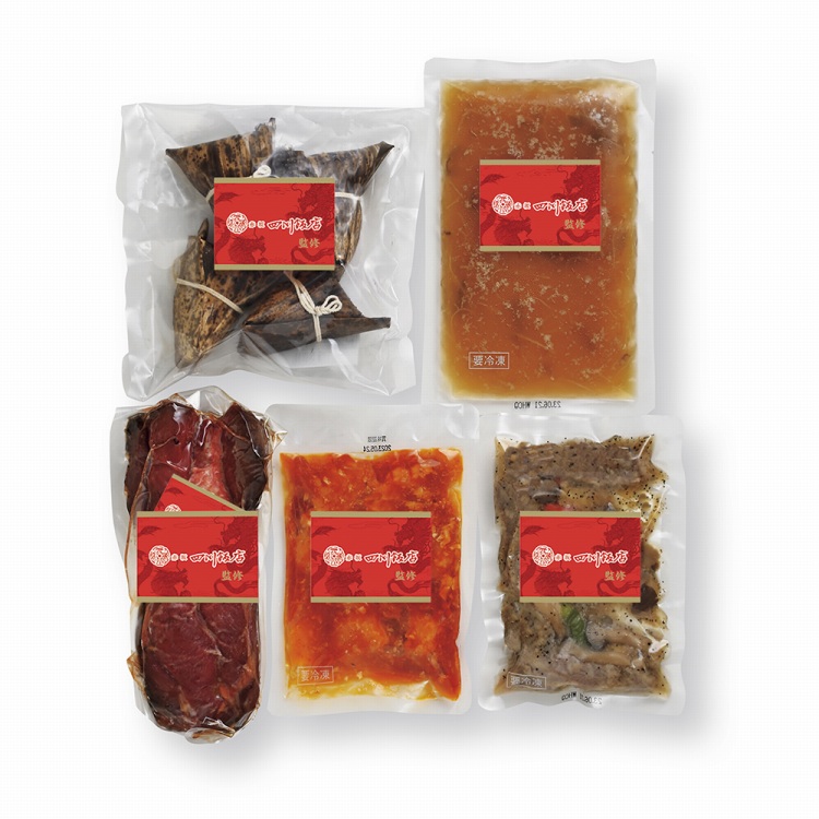 商品内容●セット内容:つるし焼豚430g・牛サーロインの黒胡椒炒め180g・魚翅湯(フカヒレ入りスープ)250g・大エビチリソース150g・角煮入りちまき240g(4個入)各1