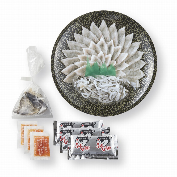 商品内容●セット内容:刺身55g・皮30g・ひれ(5枚入り)各1、ふく醤油・もみじおろし付